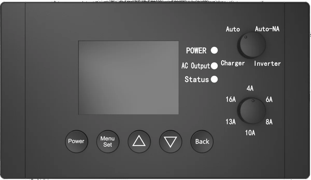 Beleuchtetes Display mit ON/OFF, Programmwahl, Landstrombegrenzung, Ladegeräteinstellung & Statusanzeige inkl.